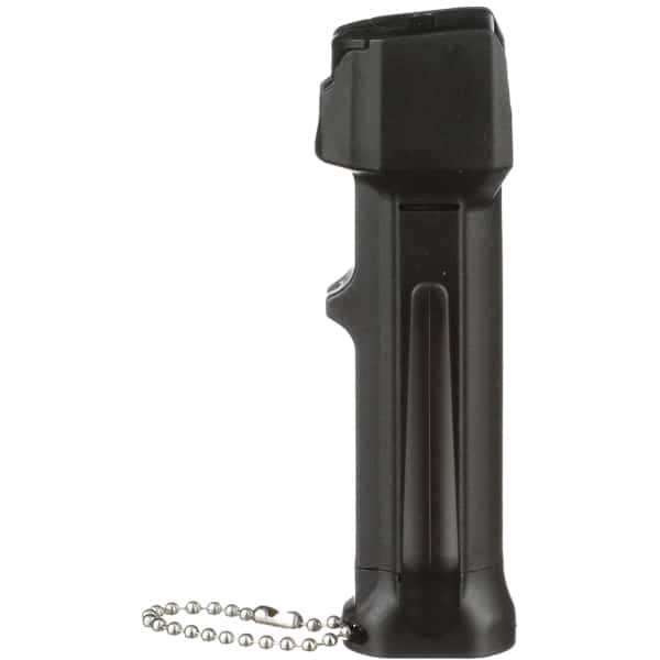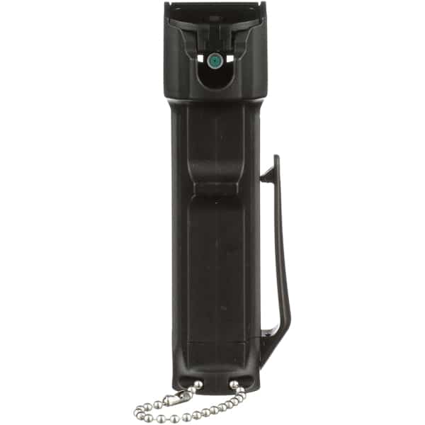 Safety features include a flip-top safety cap that prevents accidental discharge, a finger-grip dispenser for more accurate aim and built in belt clip and keychain for easy access.