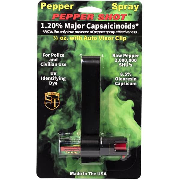 Pepper Shot 1.2% MC 1⁄2 oz w/auto visor clip. Pepper Shot Pepper Spray is made with 1.2% Major Capsaicinoids. The Major Capsaicinoids are the true heat measure and Pepper Shot 1.2% MC is more effective than of most other pepper sprays. In addition to causing an attacker pain, The Pepper Shot 8.5% oleoresin capsicum formula swells the mucous membranes, which makes breathing difficult, and swells the veins in the eyes, causing the eyes to close. It’s made from 2,000,000 SHU’s of raw pepper and these effects can last up to 45 minutes and cause no permanent damage.