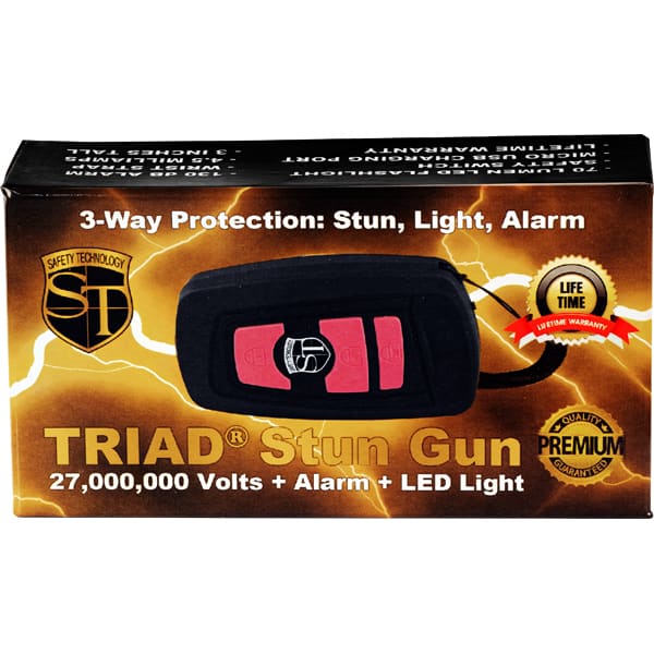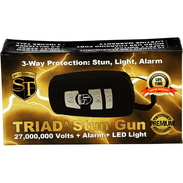 Triad 27,000,000 Stun Gun combines a powerful stun gun, an ear-piercing alarm, and an LED light into a device less than half the size of a normal stun gun.