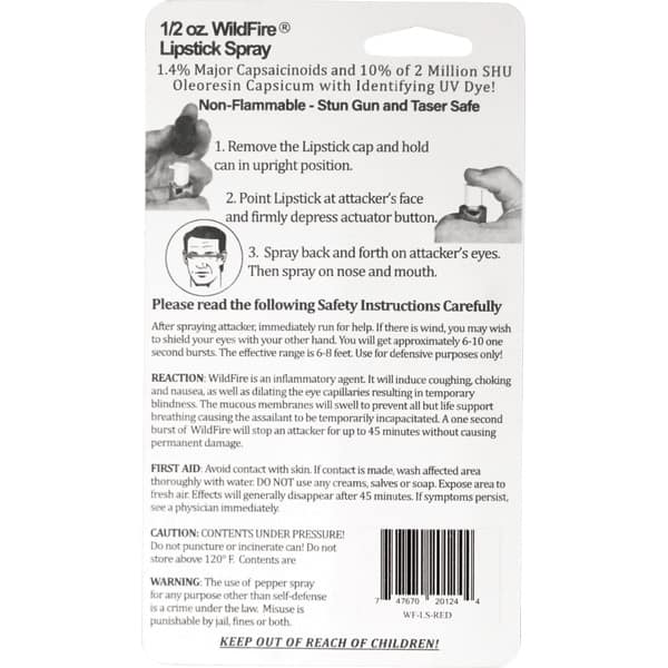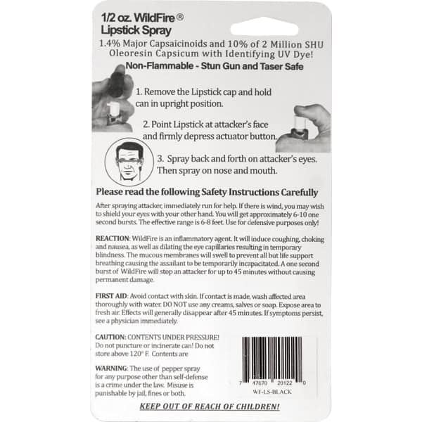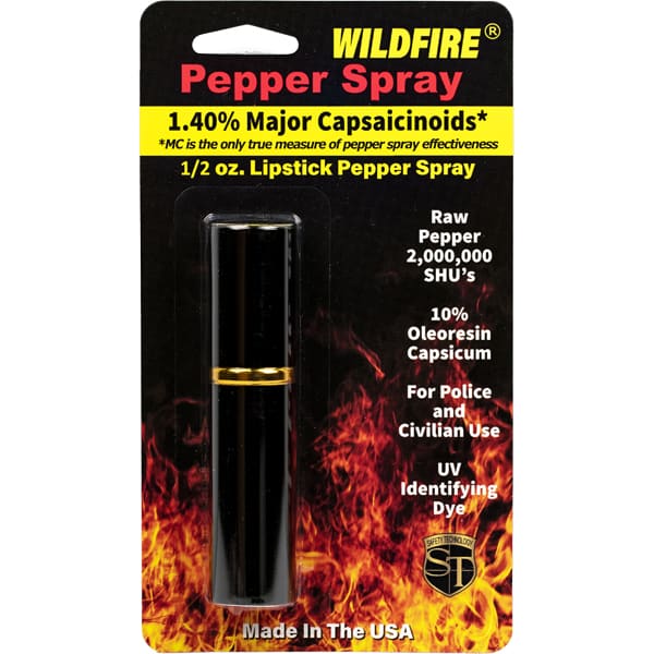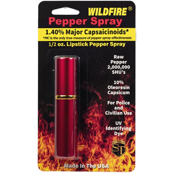WildFire™ lipstick pepper spray is a 1.4% Major Capsaicinoids pepper spray. The WildFire pepper spray is hot, hot, hot. The Major Capsaicinoids are the true heat measure, WildFire has the hottest on the market at 1.4% Major Capsaicinoids. In addition to causing an attacker pain, The WildFire 10% oleoresin capsicum formula swells the mucous membranes, which makes breathing difficult, and swells the veins in the eyes, causing the eyes to close.